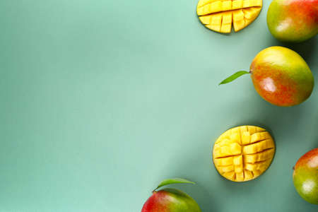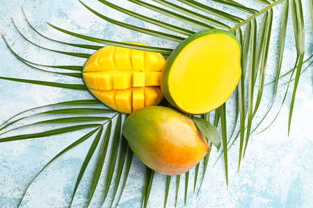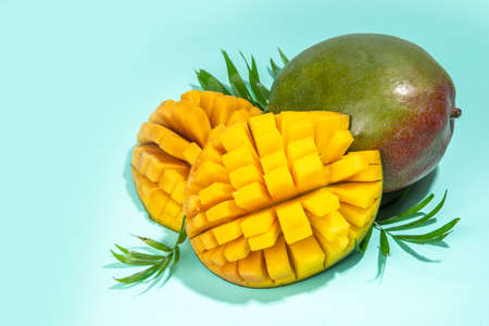 Summer background with mango and palm leaves. Fresh whole and sliced cut ripe mango fruit on bright turquoise background