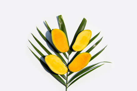 Mango on tropical palm leaves on white