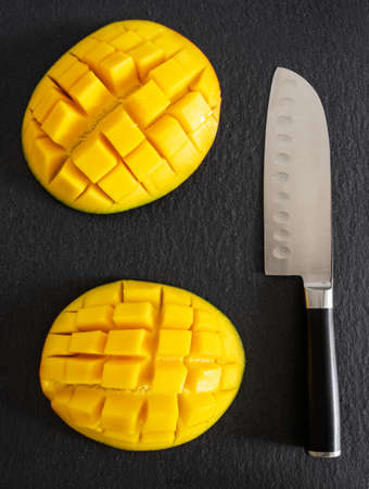 directly above shot of kitchen knife and fresh juicy mango cut in half and diced on slate cutting board