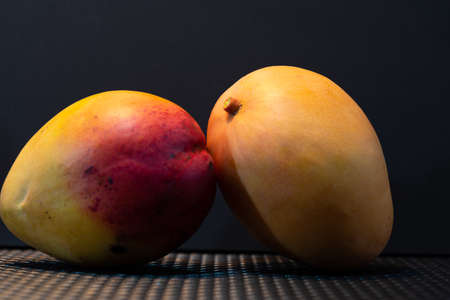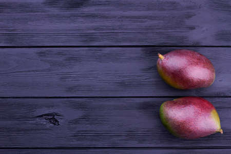 Mango fruits and copy space. Two whole mangoes on black wooden background with text space. Tasty tropical fruit.