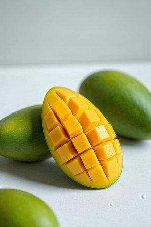 Close up of fresh mango cubes and whole fruit