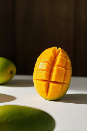 Delicious exotic mango fruit with cubes on marble surface