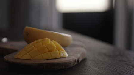 cut fresh yellow mango on wood board
