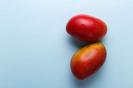 Tropical fruit, Mango on blue background. Copy space