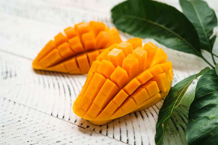Fresh mango fruit with sliced diced mango chunks on leaves as a background
