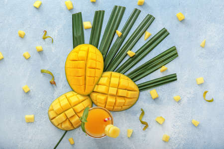 Composition with tasty mango and juice on table