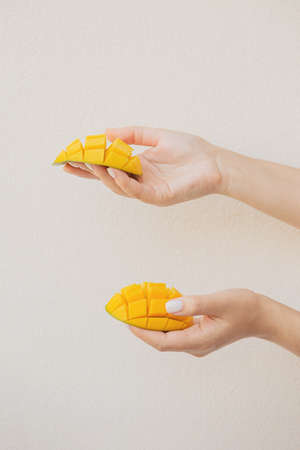 Beautiful slices of chopped mango in female hands. Vegan healthy dessert