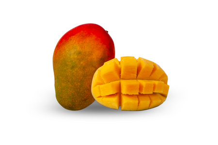 Yellow ripe sweet beautiful mango fruit and mango slice with cubes isolated white background.