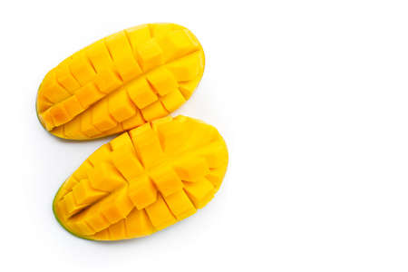 Cut ripe mangoes isolated on white. exotic fruits