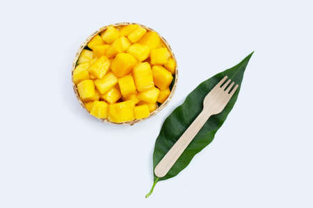 Tropical fruit, Mango cube slices in bamboo basket on white background.
