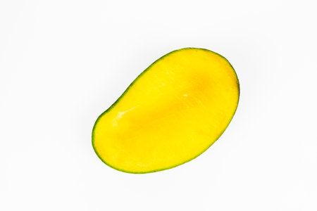 Close up one ripe yellow mango popular of fruit slices product isolated mockup on white background concept for summer tropical juice taste breakfast image. Eating fresh healthy organic food.