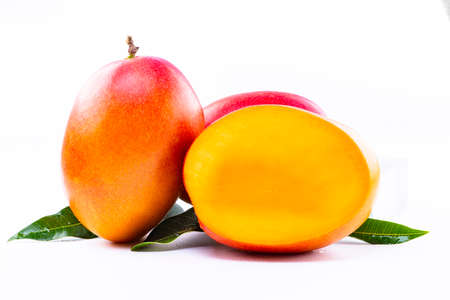 Close up of fresh Mangos with leaves on white background.