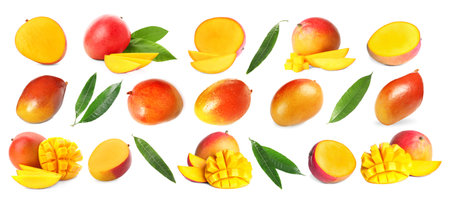 Tasty fresh mango fruits and green leaves on white background, collage