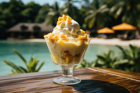 Tropical Mango Ice Cream Sundae on Beachside Resort Table with Ocean View.