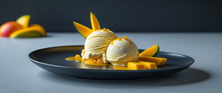 AI Generated. Stunning Mango Ice Cream Dessert on Dark Plate with Fresh Mango Slices
