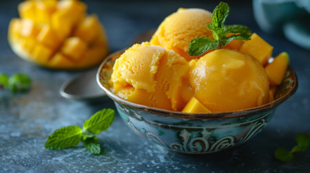 This vibrant mango sorbet served in a decorative bowl offers a refreshing treat perfect for summer. Accompanied by fresh mango chunks and mint leaves, it