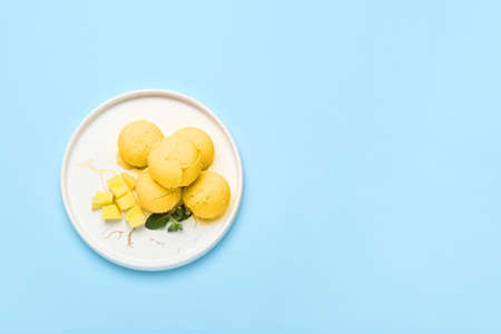 Plates with tasty mango ice cream on color background