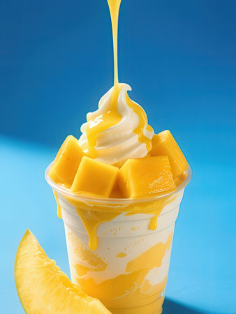Mango ice cream in a glass on blue background, close up