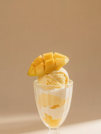 Mango ice cream with mango slices in glass on beige background