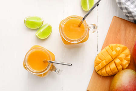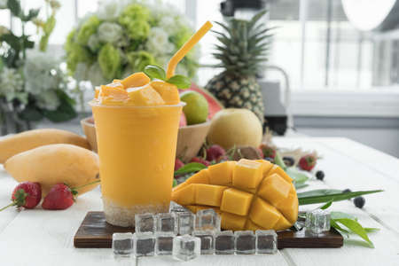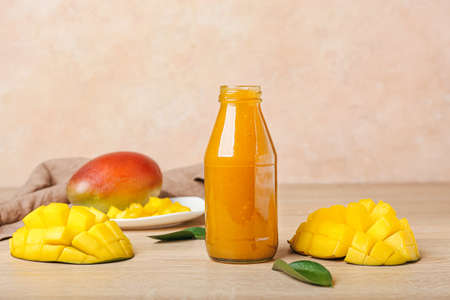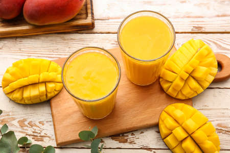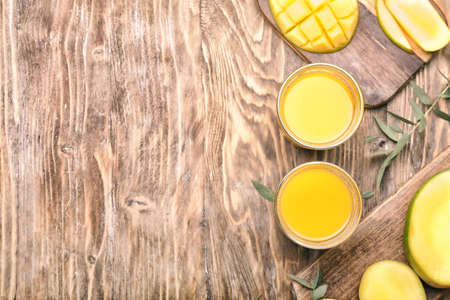 mango juice and mango on wood table, Delicious juicy smoothie with fresh mangoes