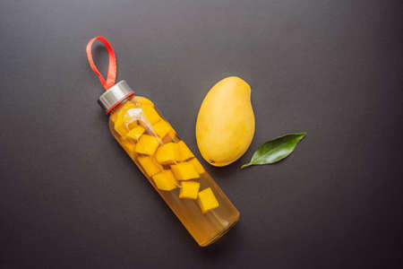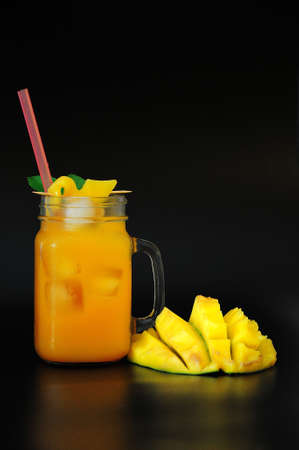 A glass mug of yellow fruit nectar with ice and a straw stands next to a cut mango on a black background. Close-up.