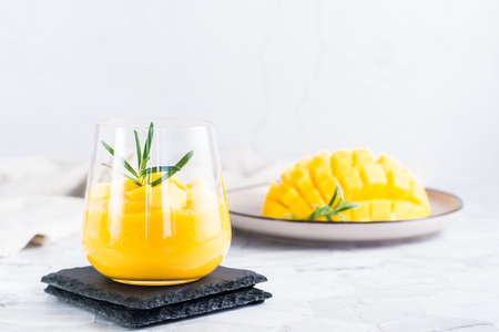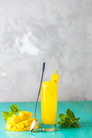 Refreshing summer cocktails made of mango, cold drink or a drink with ice on a blue gray background. Fresh summer ice cold mango cocktail or juice with mint and mango fruit.