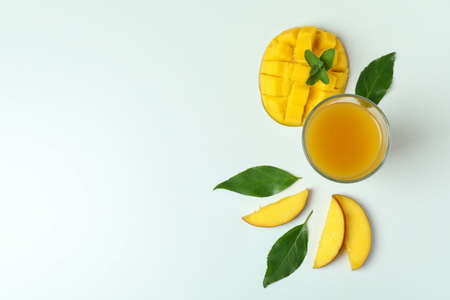Ripe fresh mango fruit and mango juice in a glass on a light background. tropical fruit