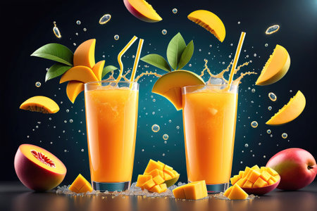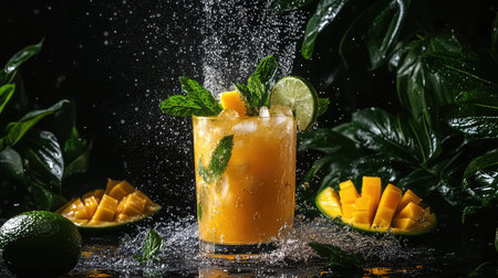 A beautifully crafted tropical mango drink with vibrant colors, featuring fresh mint, lime, and bursting ice splashes, perfect for summer gatherings.