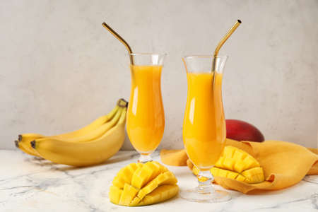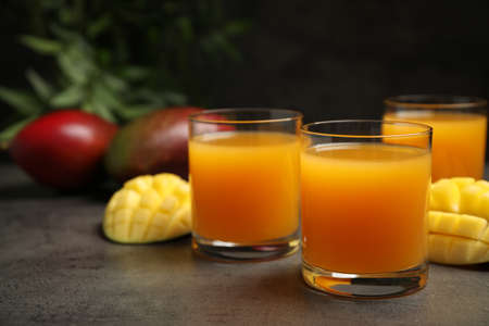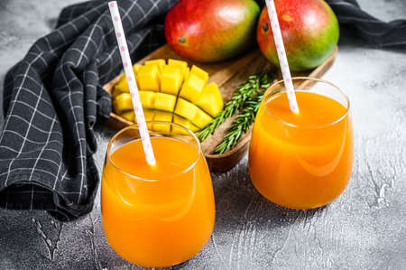 Freshly squeezed mango juice in glasses with a straw, ripe cut mango on a gray background