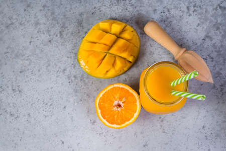 Mango smoothie with orange in a jar and with tubes stands on a gray concrete background. Clean and healthy food for vegetarians. Healthy diet. Horizontal orientation. Top view