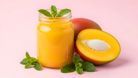 Mango smoothie in a glass jar with mint leaves on a pink background, Modern wellness background, wellness workplace, spa treatment , wellbeing healthy lifestyle,