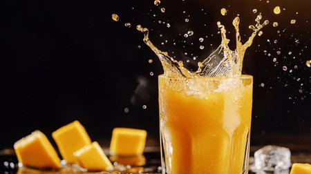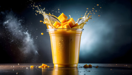 Vibrant yellow mango smoothie with fresh fruit cubes splashing into a cup, creating a dynamic and refreshing beverage concept.