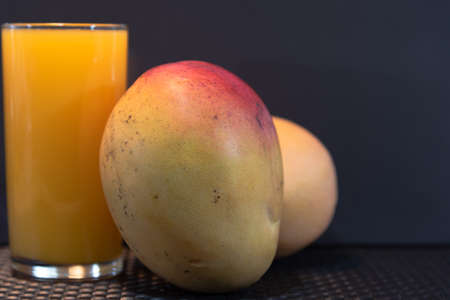 Ripe fresh mango fruit and slices and mango juice in a glass on a dark background. tropical fruit. close-up