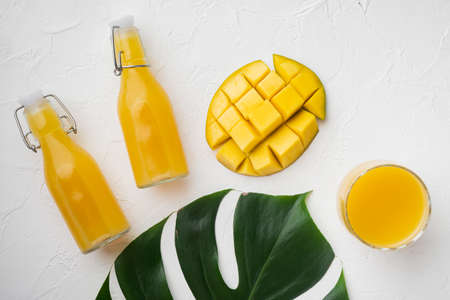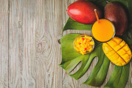 Fresh summer tropical fruit drink. Mango smoothie or mango juice, with fresh mango and tropical leaves on outdoor wooden background. Copy space top view.