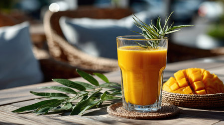 A vibrant glass of tropical smoothie featuring fresh mango, garnished with green leaves, set on a rustic wooden table in a sunlit outdoor cafe.