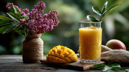 This image showcases a refreshing glass of mango juice garnished with a leaf, accompanied by a lilac flower arrangement, perfect for summer enjoyment.