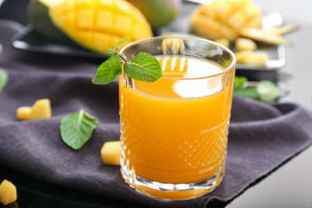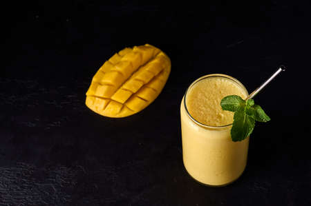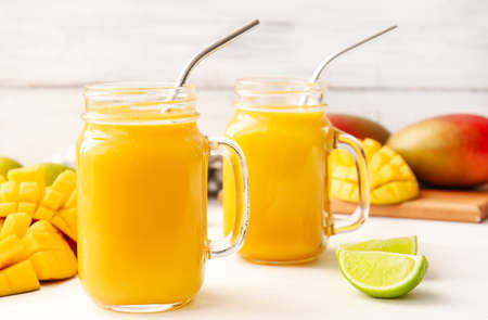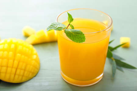 Mango juice (Mangifera indica). Tropical fruit. Fruit rich in fiber. Glass of ripe mango juice. Fresh fruits. Drink rich in vitamins. Healthy food. Mango shake. Tropical fruits.