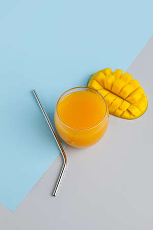 Fresh beautiful delicious mango juice. Close up design concept of smoothie cold drink in a glass cup with paper straw on gray table background.