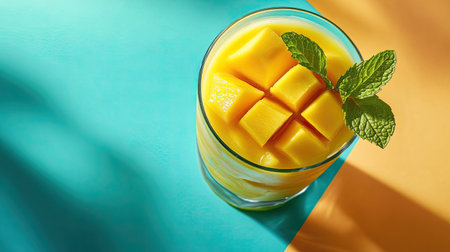 A glass of refreshing aamras with mango slices and mint garnish on a colorful background. Copy space.