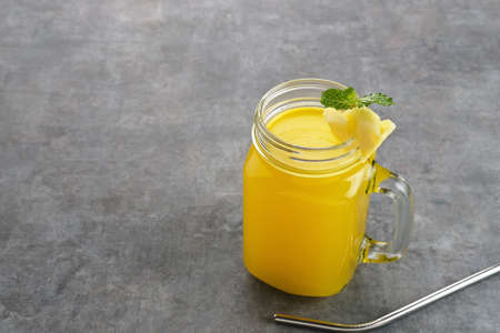 Mango smoothie with orange in a jar and with tubes stands on a gray concrete background, green leaves around. Clean and healthy food for vegetarians. Healthy diet.
