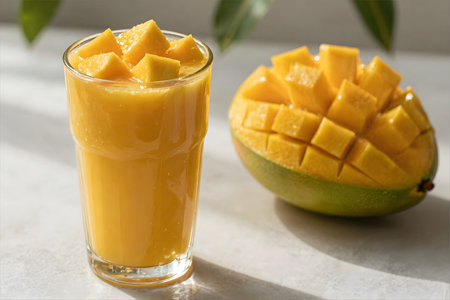 A glass of fresh mango juice stands next to neatly cut mango slices on a light surface. Natural sunlight highlights the vibrant colors of the fruit and drink.