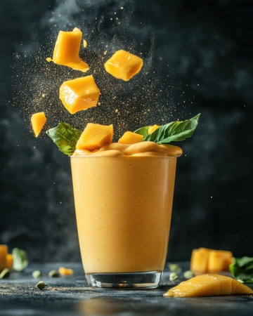 Indulging in a delicious mango lassi, fresh mangoes dance above creamy swirls while a sprinkle of cardamom adds a hint of spice, illuminated against a dark, textured background