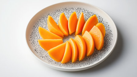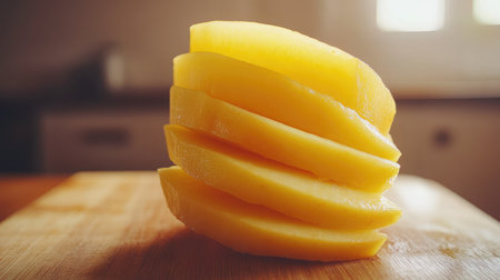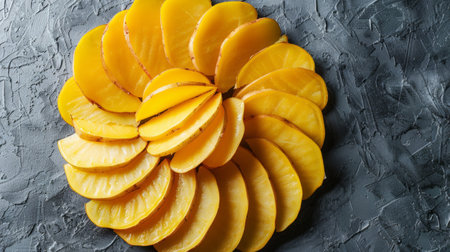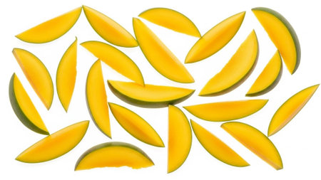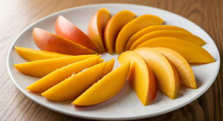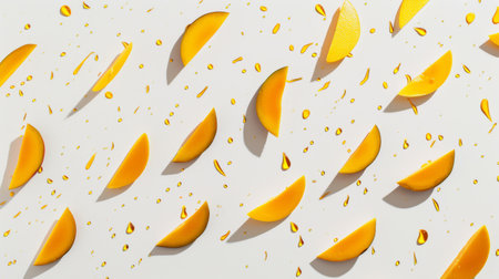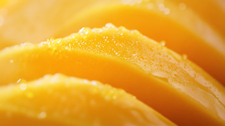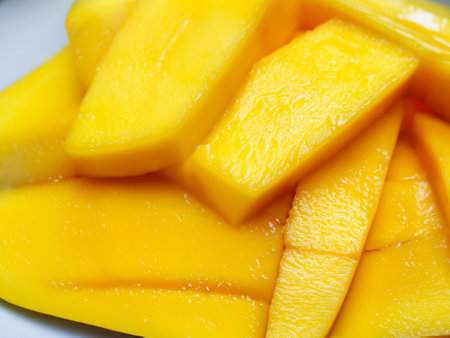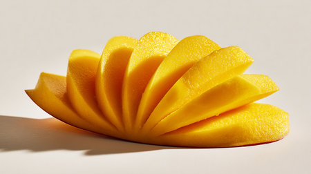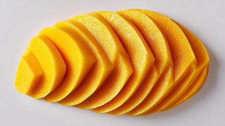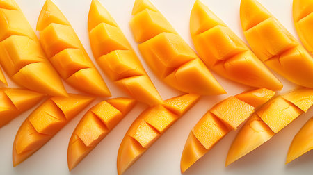 A close-up image showcasing ripe mango slices artistically arranged