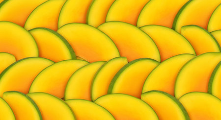 A close-up, seamless pattern of bright yellow mango slices with a thin green rind, filling the frame.