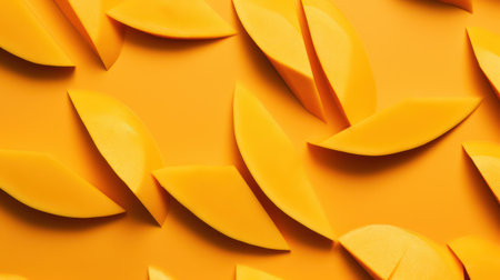 Colorful mango slices beautifully arranged on a vibrant orange background offer a feast for the eyes, perfect for showcasing freshness and tropical flavors.