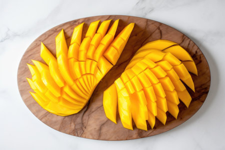 an overhead shot of sliced mango on a marble board, created with generative ai
