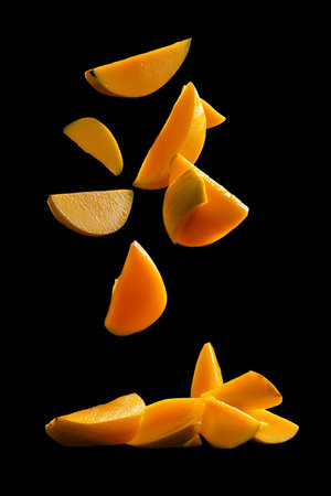 Mango slices flying in the air on a black background. Close up