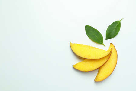 Tropical fruit, Mango slices on white background. Copy space
