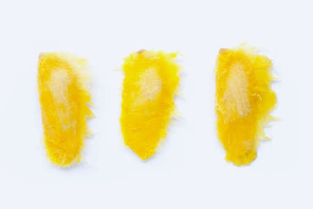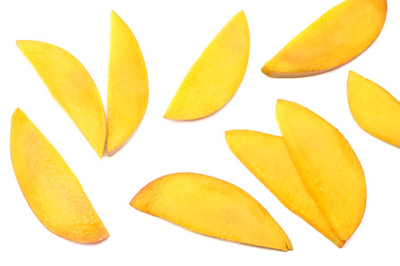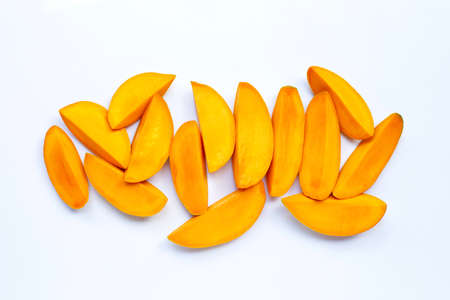 Mango fruit slices on white background.