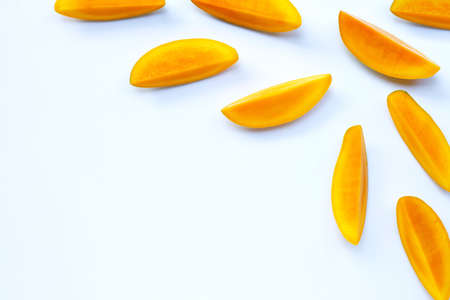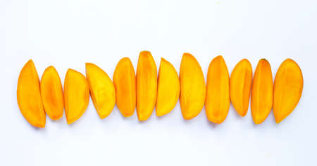Tropical fruit, Mango fruit slices on white background. Copy space
